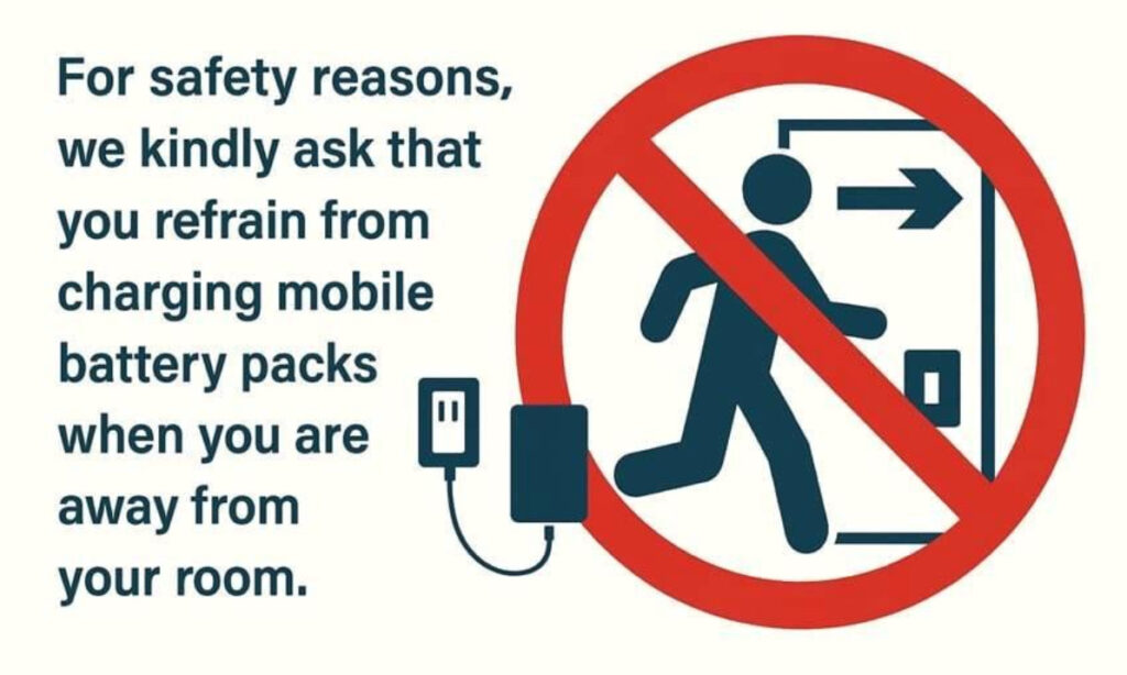 ご滞在中の客室清掃時に、安全確保の観点から上記のような状況が確認された場合、スタッフがモバイルバッテリーの位置を移動、 あるいは充電停止の措置をとらせていただく場合がございます。あらかじめご了承ください。